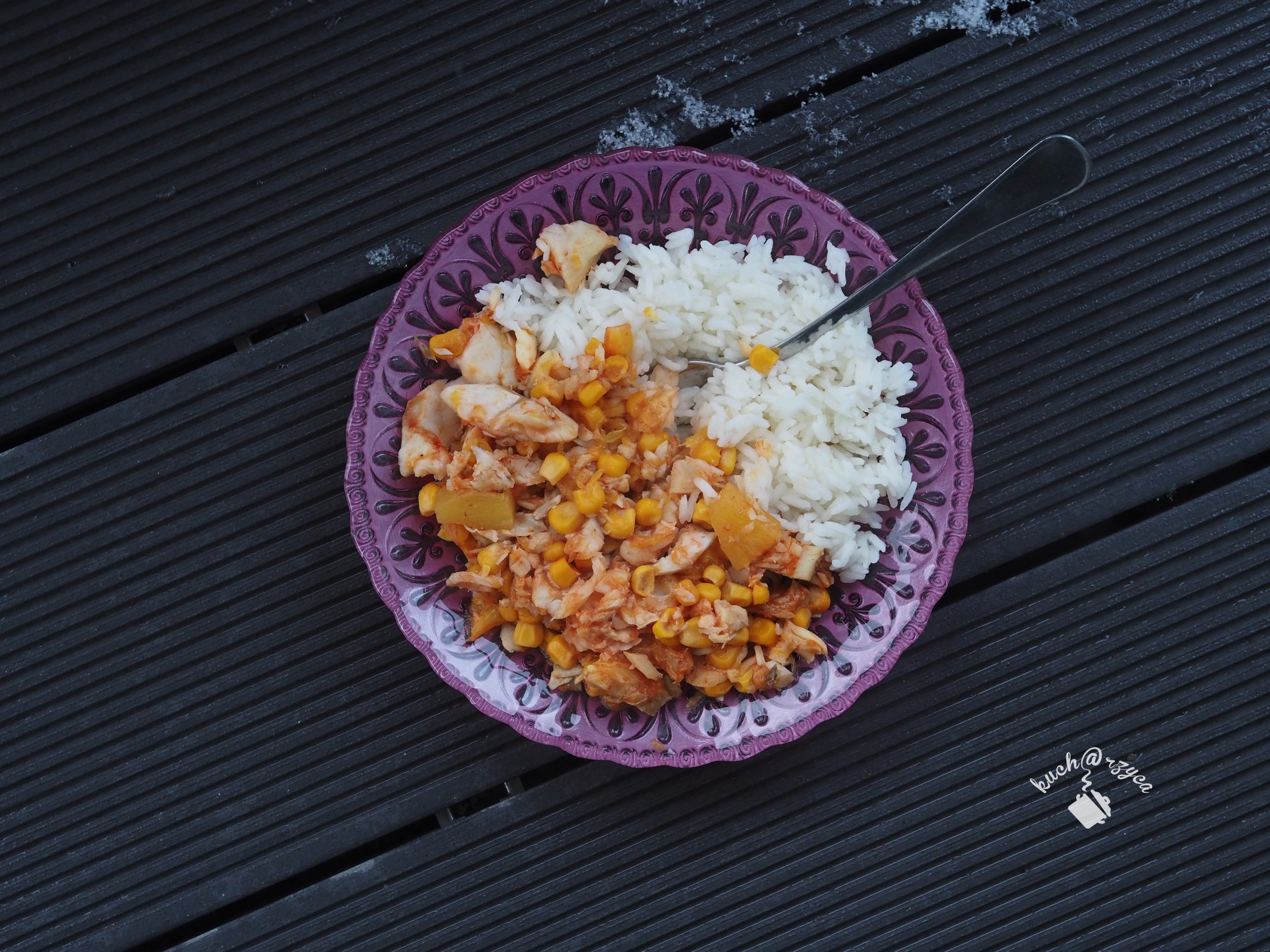 Dorsz, ale pstrąg też być może. Duszony w pomarańczach, z kukurydzą i ananasem.…