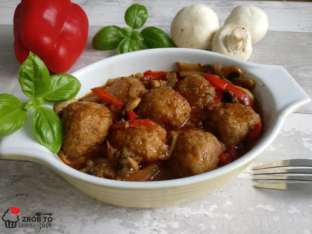 Czy są tu wielbiciele papryki i pieczarek? Przyznam, że jako dziecko nie znosiłam ani smaku ani zapachu papryki a teraz jem ją kawałkami. Polecam połączyć te dwa składniki z pulpetami i wykonać pyszne danie na obiad. Można podać to z ryżem, kaszą, makaronem, kluskami… wszystkim tym na co tylko macie