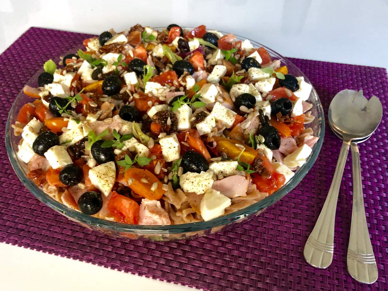 Szybka, smaczna, zdrowa i niskokaloryczna sałatka z kolorowymi warzywami, makaronem razowym i wędzonym kurczakiem. Świetnie sprawdzi się na przyjęciu, ale może też posłużyć jako rodzinna kolacja albo drugie śniadanie do pracy lub szkoły. Polecam!