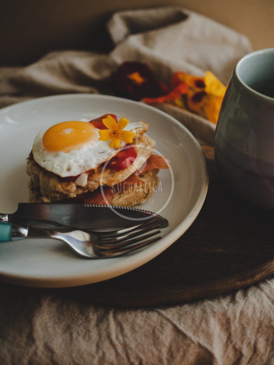 Tak je nazwałam, ponieważ powstały w odpowiedzi na brak chleba i chęci zejścia do piekarni. Którą, swoją drogą, mamy w bloku, w którym mieszkamy, a dodatkowo jeszcze dwie w bliskiej okolicy. Szczyt lenistwa. Żeby nie było, że ten szczyt taki wysoki. Placki są bardzo sycące. Z powodzeniem zastąpią pieczywo, nie