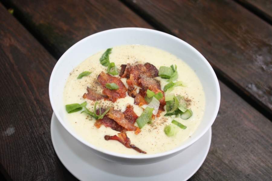 Serowa kartoflanka z chipsem z bekonu brzmi na pewno tucząco , ale nie dajcie się zwieść . Zupa ta jest z dodatkiem kremowego serka topionego , oraz dużą ilością duszonego pora , a to ja odciąża Bynajmniej tak myślę , bo jest obłędnie pyszna .
