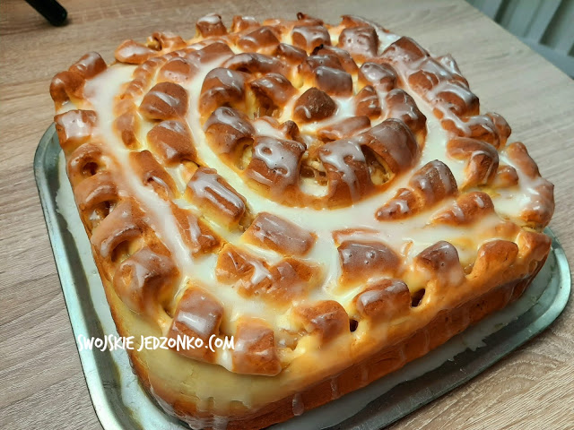 PYSZNA,WILGOTNA DROŻDŻÓWKA,ZE SŁODKIM LUKREM I JABŁKAMI Z CYNAMONEM-ZASKOCZYŁA MNIE SMAKIEM I JESZCZE NA CIEPŁO ZNIKNĘŁO PÓL BLASZKI-POLECAM