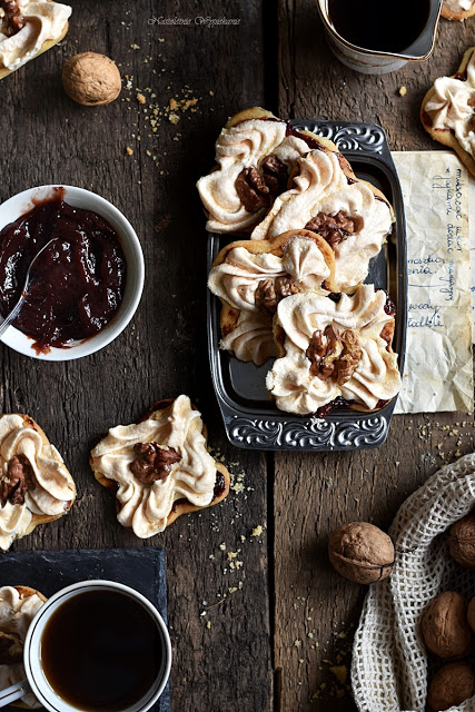 Kruche ciasteczka wysmarowane powidłami śliwkowymi z bezą na wierzchu i orzechami włoskimi. Jeśli w świątecznych lub weekendowych planach macie jedynie ciasta to polecam przygotować coś drobnego, czym zawsze będzie można się poczęstować przy stole. Te ciasteczka nadają się do tego jak żadne inne!