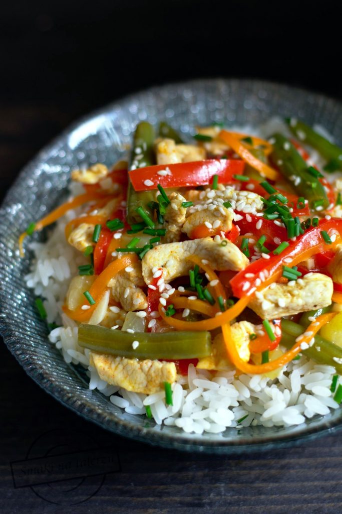 około 500 g piersi kurczaka2 czerwone papryki1 duża marchewkaokoło 350 g fasolki szparagowej zielonej (może być mrożona)kawałek ananasa (lub ananas z puszki)4 ząbki czosnkuokoło 4 cm kawałek imbiru1/4 szkl. octu ryżowego (ja zastępuję go sokiem z cytryny)4 łyżki brązowego cukru1/3 szkl. wody1 łyżka
