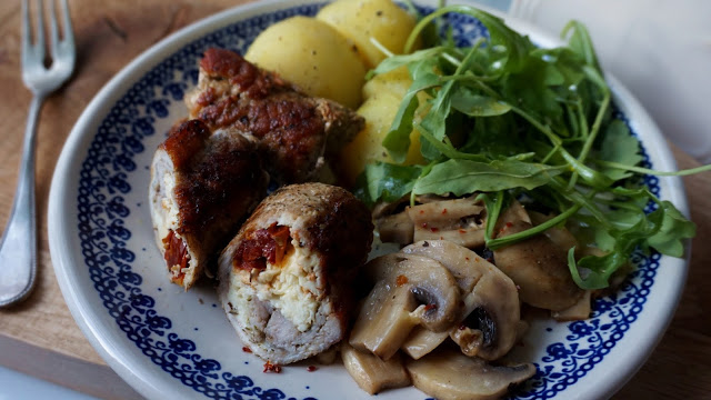 Duszone w pieczarkach kruche roladki ze schabu, nadziane suszonymi pomidorami i wyrazistym…