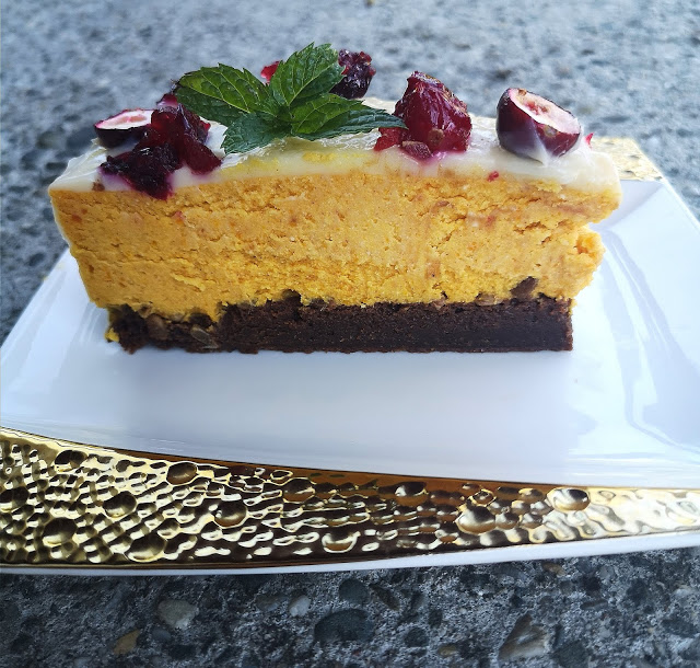 To jesienna poezja smaku. Połączenie dyni z twarogiem i czekoladą. Tak! Bowiem spód tego sernika to ciasto brownie. Czyż może być bardziej wyrafinowana kompozycja smaku? I do tego jeszcze polewa z białej czekolady i kuszący smak kwaskowej żurawiny, przełamany odrobiną miodu. Ten
