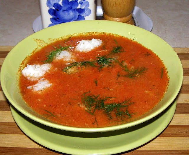 włoszczyzna młoda 1 pęczek, liść laurowy 1 sztuka, ziele angielskie 2 sztuki, kostka rosołowa 2-3 sztuki, woda 2,5 litra, pomidory dojrzałe 1 kg, sól 1 łyżeczka, pieprz mielony 1 łyżeczka, śmietana 12% 200 gram, ugotowany ryż 2 woreczki, koperek 1/2 pęczka