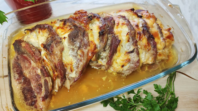 Składniki: Karkówka 1,5 kg ( 9 plastrów)Cebula dużaMajonez 8 łyżekSer żółty 8…