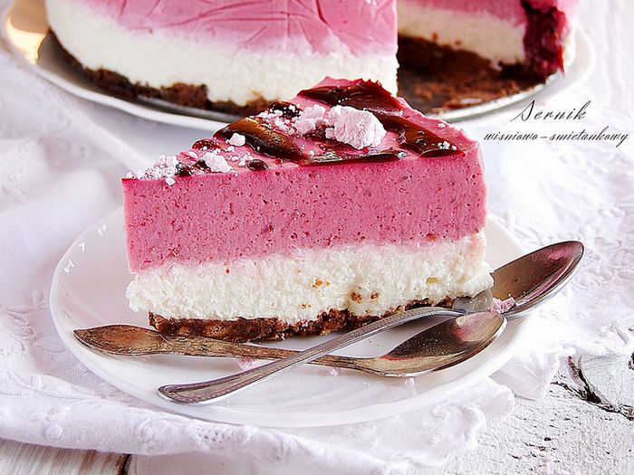 …lubicie serniki na zimno? My bardzo i dość często je robię dziś proponuję w wersji z wiśniami pyszny dwukolorowy wiśniowo-śmietankowy sernik na zimno. Proporcje na tortownicę o średnicy 22cm…