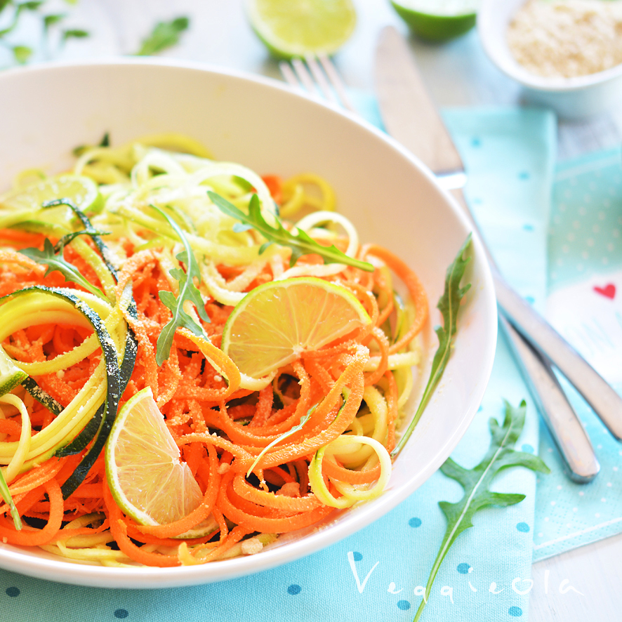 Surowe spaghetti warzywne i test krajalnicy spiralnej