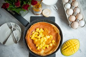 Już dawno chciałam dodać ten przepis na bloga, bo to idealny pomysł na weekendowe śniadanko na słodko – Dutch Baby. Jest to puszysty, pieczony naleśniki, który jest dobrze znany w kuchni amerykańskiej. Wystarczy kilka składników na ciasto naleśnikowe, świeże owoce i gotowe! Do jego przyrządzenia potrzebne jest mniejsze naczynie żaroodporne,