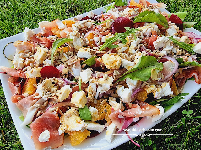 Pyszna lekka sałatka, słodko słona, z buraczkami i pomarańczami, do tego zielone…
