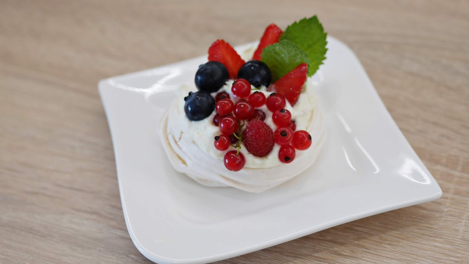 Pyszne mini bezy z owocami, estetycznie prezentują się na talerzyku fala marki