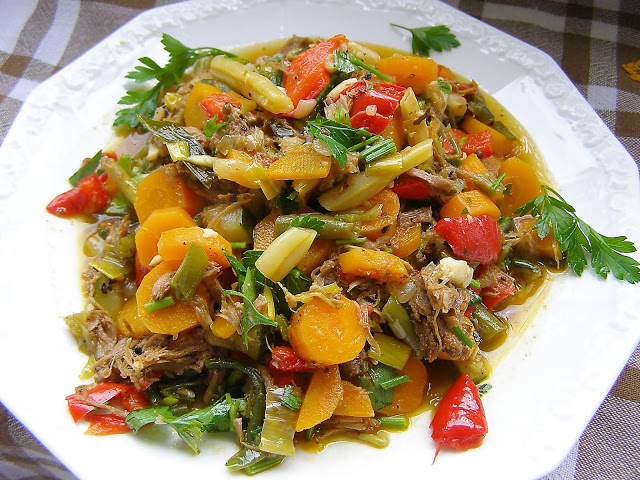 papryka 2 sztuki, marchew 4 sztuki,cukinia 2 sztuki średnie, fasolka szparagowa 50 dag, ząbki czosnku 5 sztuk,por 1 sztuka duża ,cebula 1 sztuka, kostka rosołowa 2 sztuki, pieprz mielony 1/2 łyżeczki, pieprz ziołowy 1 łyżeczka, papryka ostra 1/2 łyżeczki, mięso z indyka