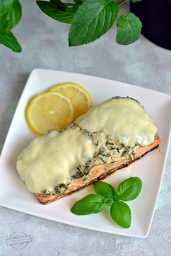 2 łososie (około 300 g każdy)2 garści świeżego szpinaku1 małe op. jogurtu naturalnegomozzarella (może być w zalewie, w plastrach lub tarta – chociaż tę ostatnią najtrudniej wyłożyć)granulowany czosneksok z cytrynysól, pieprz
