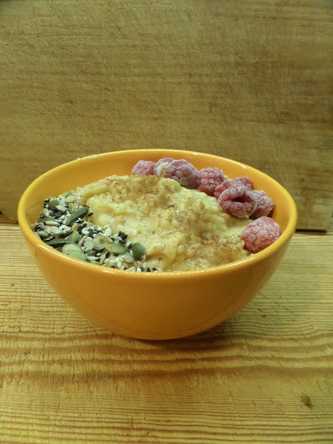 dyniowo-jabłkowe kluski na mleku sojowym z malinami i mieszanką nasiona, oprószone cynamonemprzepis…