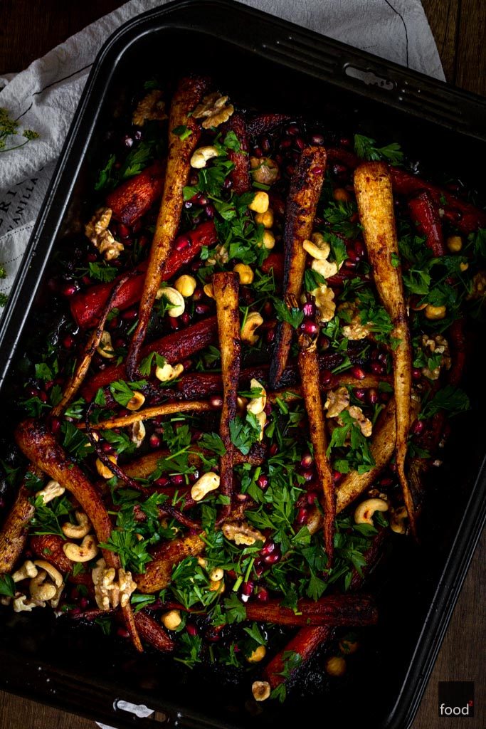 Jesienią bardzo lubię piec korzenie i bulwy. Warzywa podczas powolnego pieczenia z aromatycznymi przyprawami nabierają cudownej słodyczy. Ich skórka karmelizuje się, nabierając chrupkości, a wnętrze staje się rozkosznie miękkie. Według tego przepisu możemy upiec dowolne warzywa korzeniowe, jednak moimi zdecydowanymi faworytami są pietruszka i marchew, które dzięki odpowiedniej obróbce termicznej
