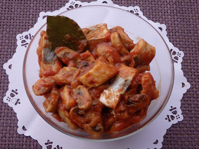 Śledzie w pomidorach z pieczarkami