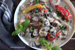 Duszony filet z kurczaka z papryką, pieczarkami i oliwkami. To danie obiadowe pełne warzyw zapewni nam komfort jedzenie przy niewielkiej pracy. Atrakcyjne są dania z piersią z kurczaka, przede wszystkim są łatwe i pyszne. Wystarczy połączyć kilka wspaniałych składników takich jak: papryka, oliwki,