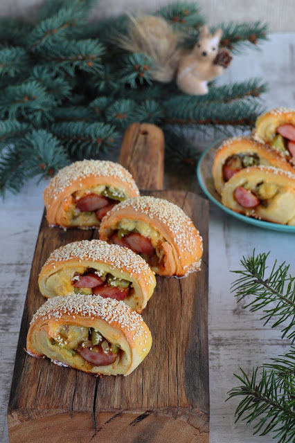 Paszteciki z kiełbasą, ogórkiem kiszonym i serem smakują rewelacyjnie nie tylko na ciepło, ale również na zimno. Świetnie się sprawdzą na kolację lub przekąskę. Wiem, że do Nocy Sylwestrowej jeszcze daleko, ale wierzcie mi, że taka przekąska będzie idealna, bo paszteciki są przepyszne i świetnie się prezentują. Muszę przyznać,