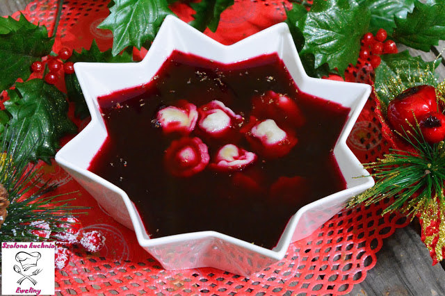 Czerwony barszcz z postnymi uszkami, który jest tradycyjną potrawą podawaną w czasie…