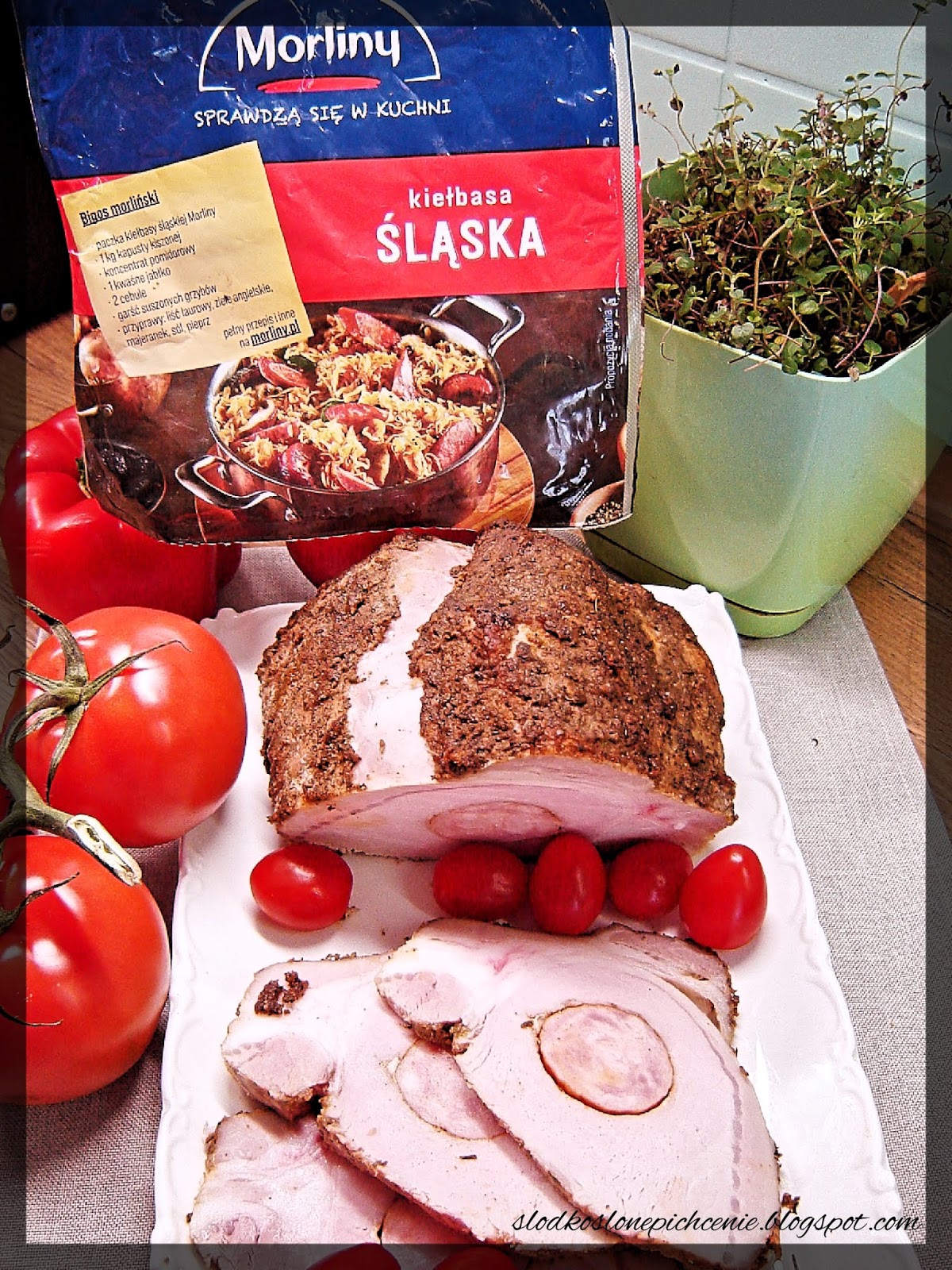 Schab po sztygarsku – składniki:1 kg schabu bez kościkiełbasa śląska Morliny o długości schabu (u