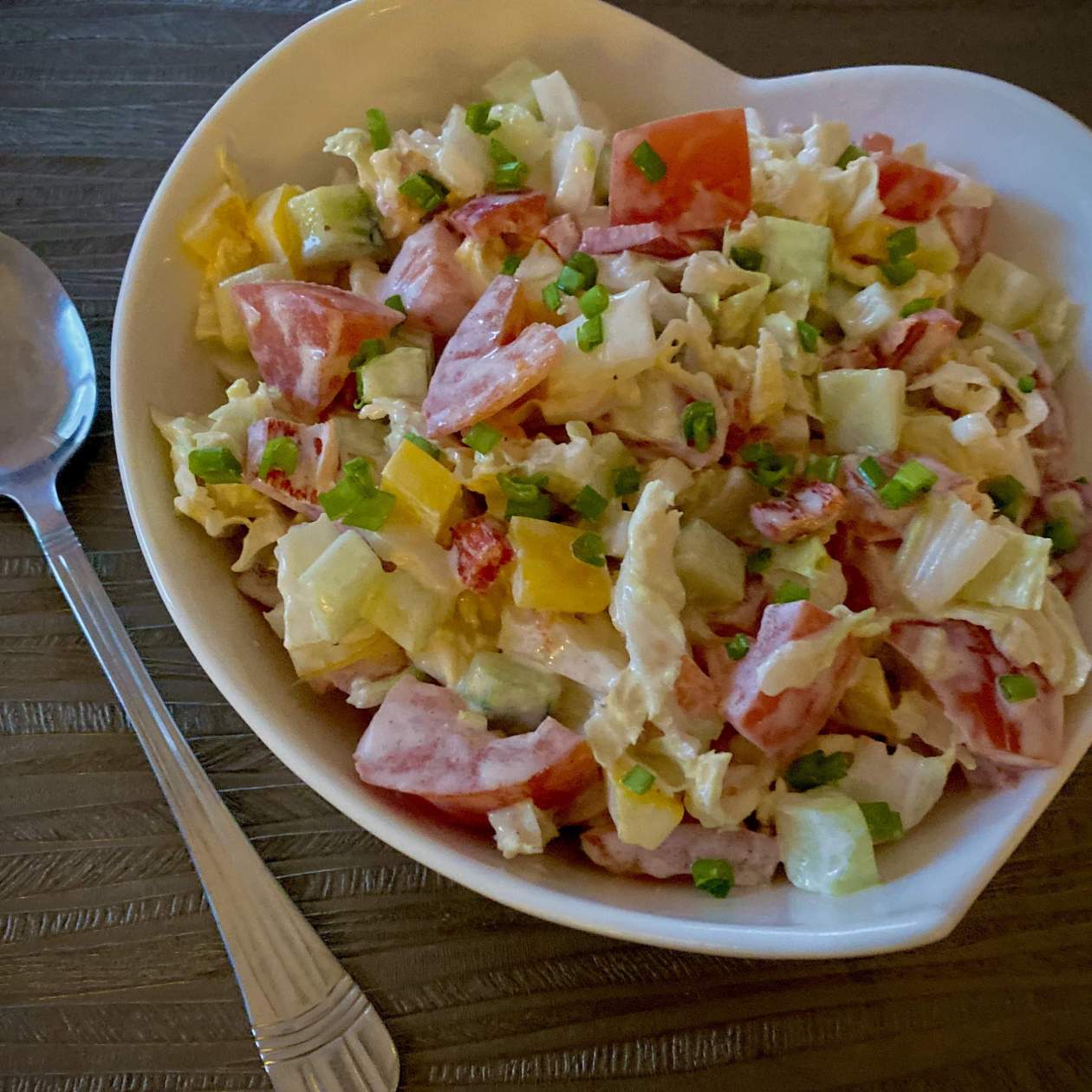 Bardzo smaczna surówka warzywna z dodatkiem sosu czosnkowo-majonezowego. Świetnie sprawdza się jako dodatek do kebabów, burgerów, hot-dogów oraz jako surówka do obiadu.