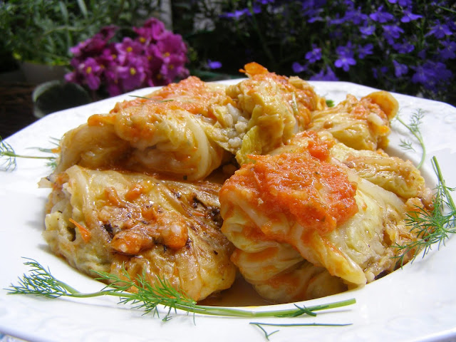 kapusta włoska młoda 2 główki, ryż ugotowany 3 woreczki, kucharek 2 łyżki, marchew z rosołu 4 sztuki, cebula podsmażona 2 sztuki na oleju – z 1 łyżeczką cukru, pieprz mielony 1 łyżeczka, koperek 1 pęczek, jajka 2 sztuki, mielone drobiowe 50 dag, liść laurowy 1 sztuka, ziele