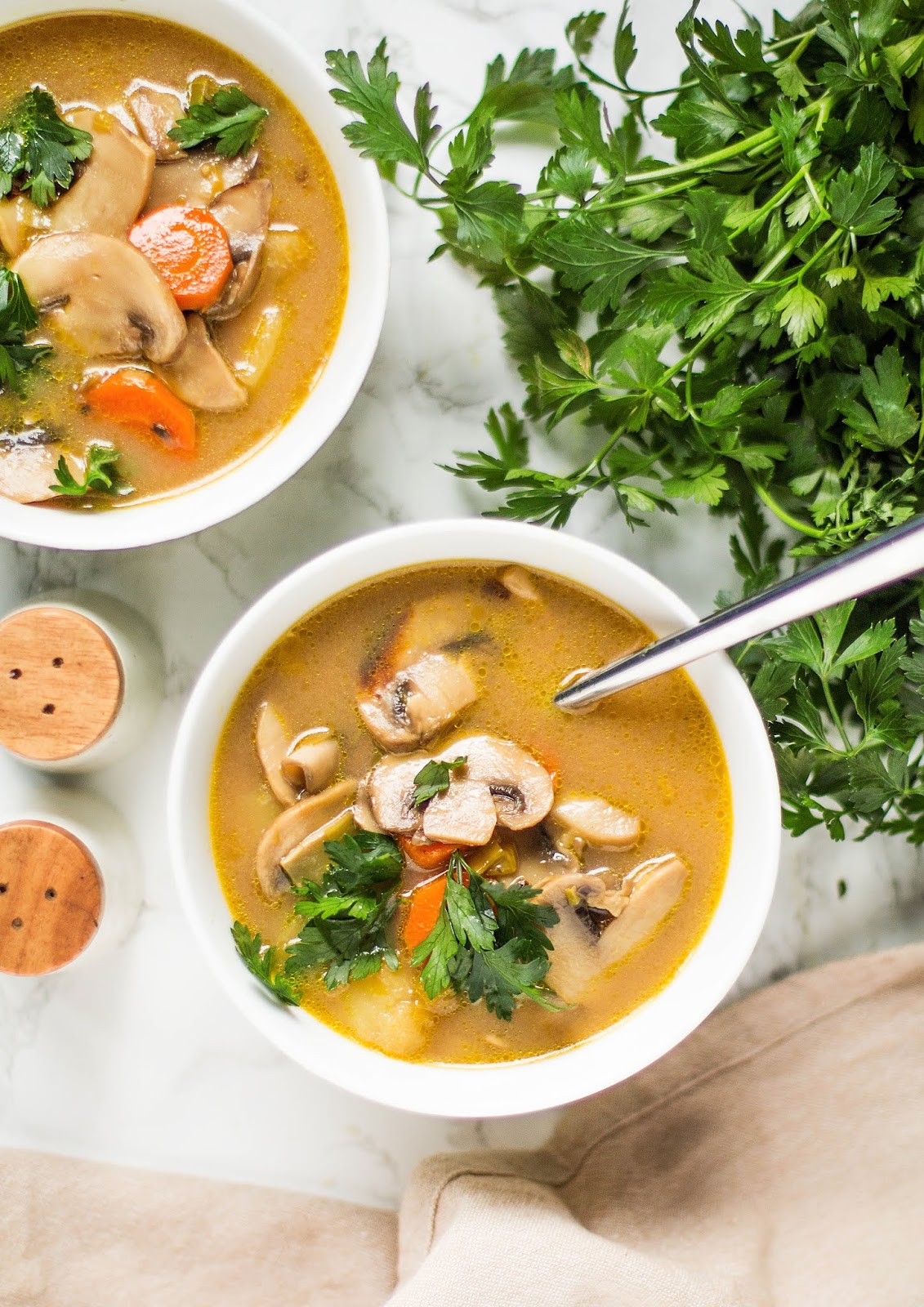 Kolejna zupa na rozgrzewkę, tym razem klasyczna pieczarkowa. Cała masa przysmażanych pieczarek, aromatyczny por oraz marchewka oraz ziemniaki, które polecam stosować zamiennie z drobnym makaronem, np. muszelkami.