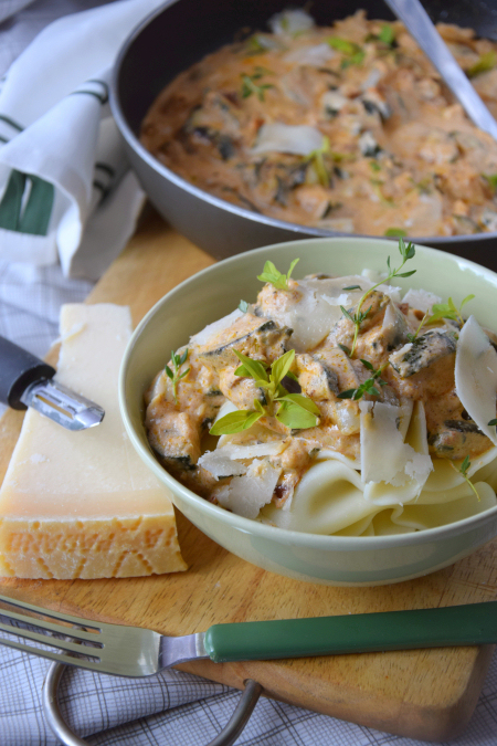 Kremowy do granic możliwości, pełen smaku i aromatyczny wege sos poleca się do wypróbowania. Dzięki pieczeniu ze smakową oliwą, cukinia oddaje do sosu maksimum swojego smaku, suszone pomidory dodają aromatu a śmietana i serek odpowiadają za ekstra kremowość. Do tego świeże zioła, parmezan i możemy obficie polać tym