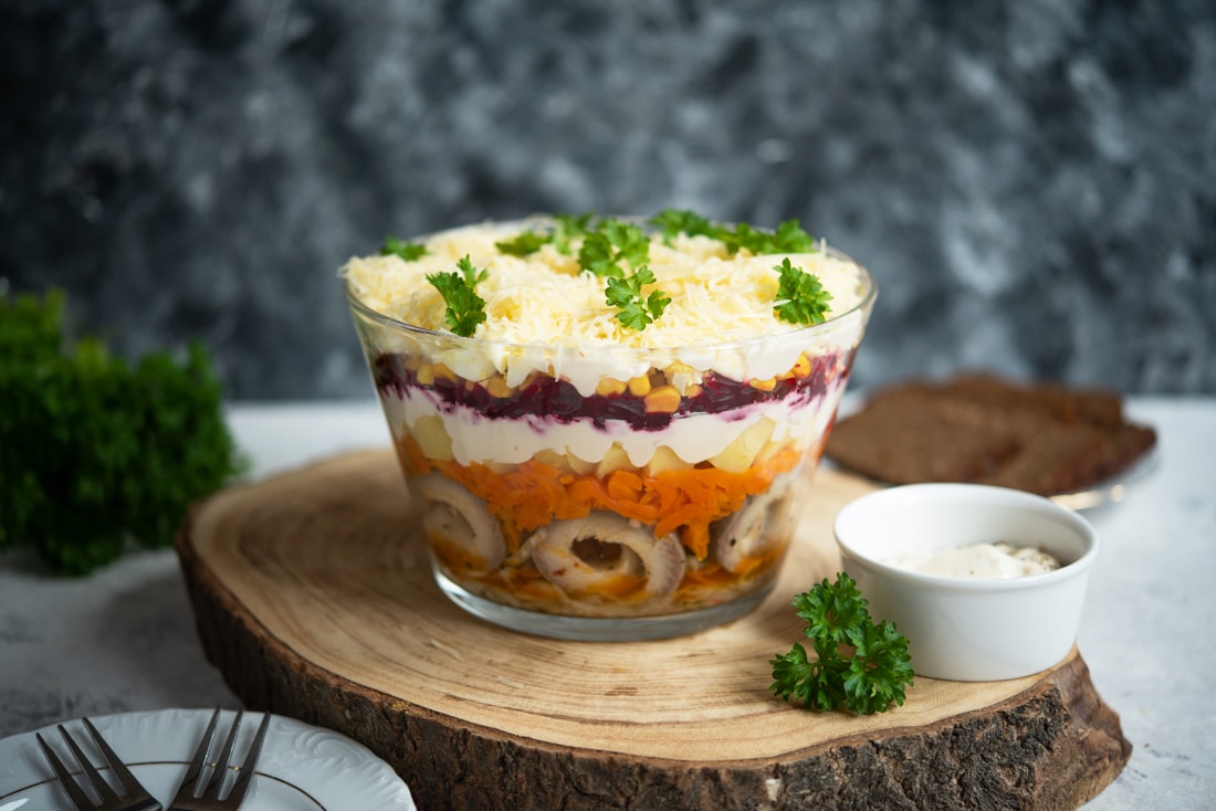 Śledzie pod pierzynką to warstwowa sałatka rybna, którą bardzo lubię i robię co jakiś czas podczas rodzinnych uroczystości. Muszę przyznać, że to jedna z obowiązkowych potraw na Święta Bożego Narodzenia. Oczywiście oprócz klasycznej sałatki jarzynowej, bez której Świąt by nie było!