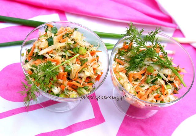 Przygotowanie:Kapustę poszatkować, posypać odrobiną soli i ucisnąć by szybciej zmiękłaPo ok. 15 min.kapustę wygnieść, odcisnąć ewentualny sokDodać pokrojony koper, szczypiorek z cebulką, zetrzeć marchewSkładniki posypać lekko pieprzem,