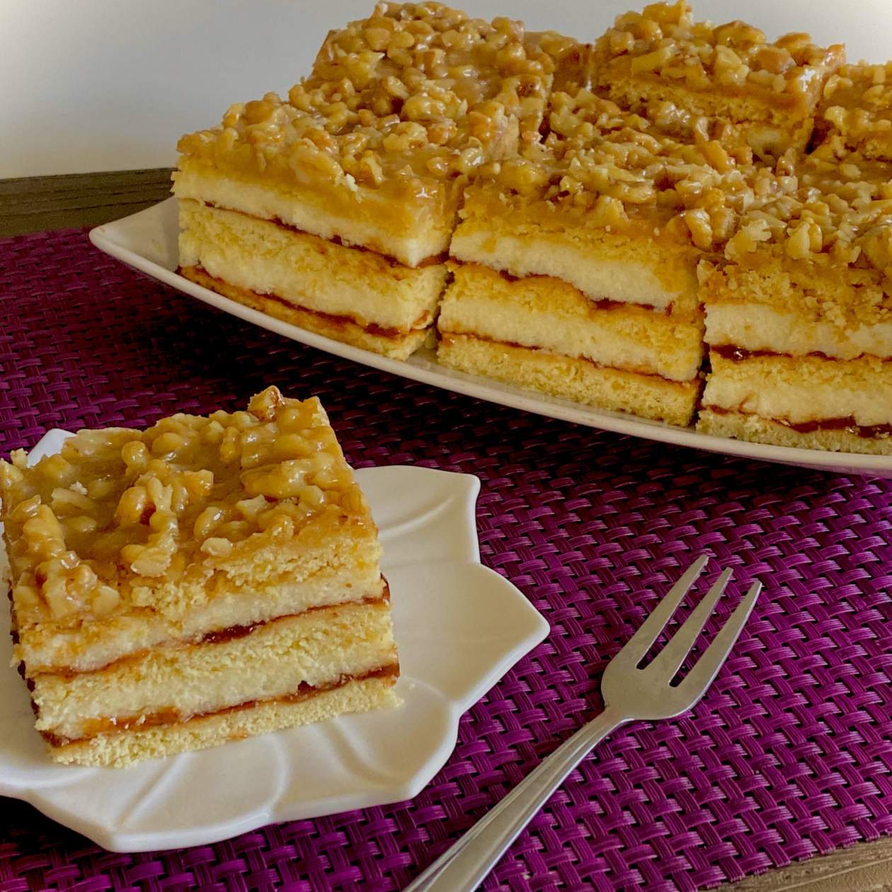 Miodowo-orzechowe ciasto przekładane delikatną masą grysikową oraz powidłami śliwkowymi. Świetne połączenie smakowe. Ciasto najlepiej zrobić jeden, dwa dni przed podaniem, wówczas blaty zmiękną, a smaki zdążą się przegryźć.