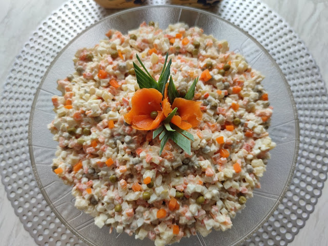 Składniki: Marchew 5 średnichZiemniaki 5 średnichJajka 6Ogórki kiszone 4 sztuki Groszek konserwowy…