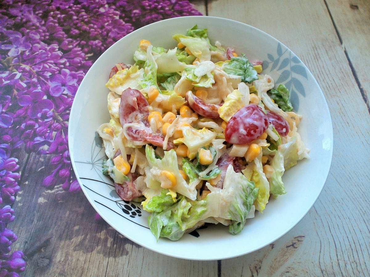Zapraszam na smaczną surówkę z sałaty rzymskiej z selerem konserwowym, pomidorkami i kukurydzą konserwową. Polecam do obiadu.Składniki :1 mała sałata rzymska6 pomidorków koktajlowych1/2 cebuli3 czubate łyżki selera konserwowego3 łyżki kukurydzy konserwowej2 łyżki jogurtu greckiegosól – do smakupieprz – do smakuSposób przygotowania :Sałatę dzielimy na liście i myjemy, przekładamy na