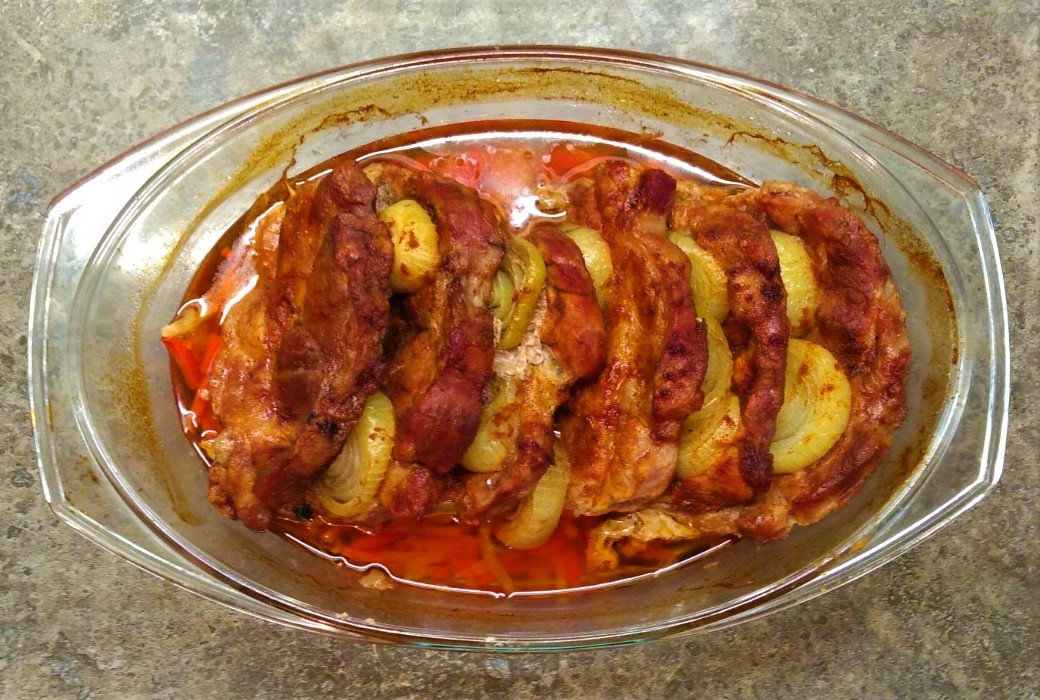 Skład: karkówka 2-2,4 kg, włoszczyzna w słupkach 300-400 g, 3 cebule, sól, pieprz, papryka,1 łyżka smalcu, opcjonalnie inne