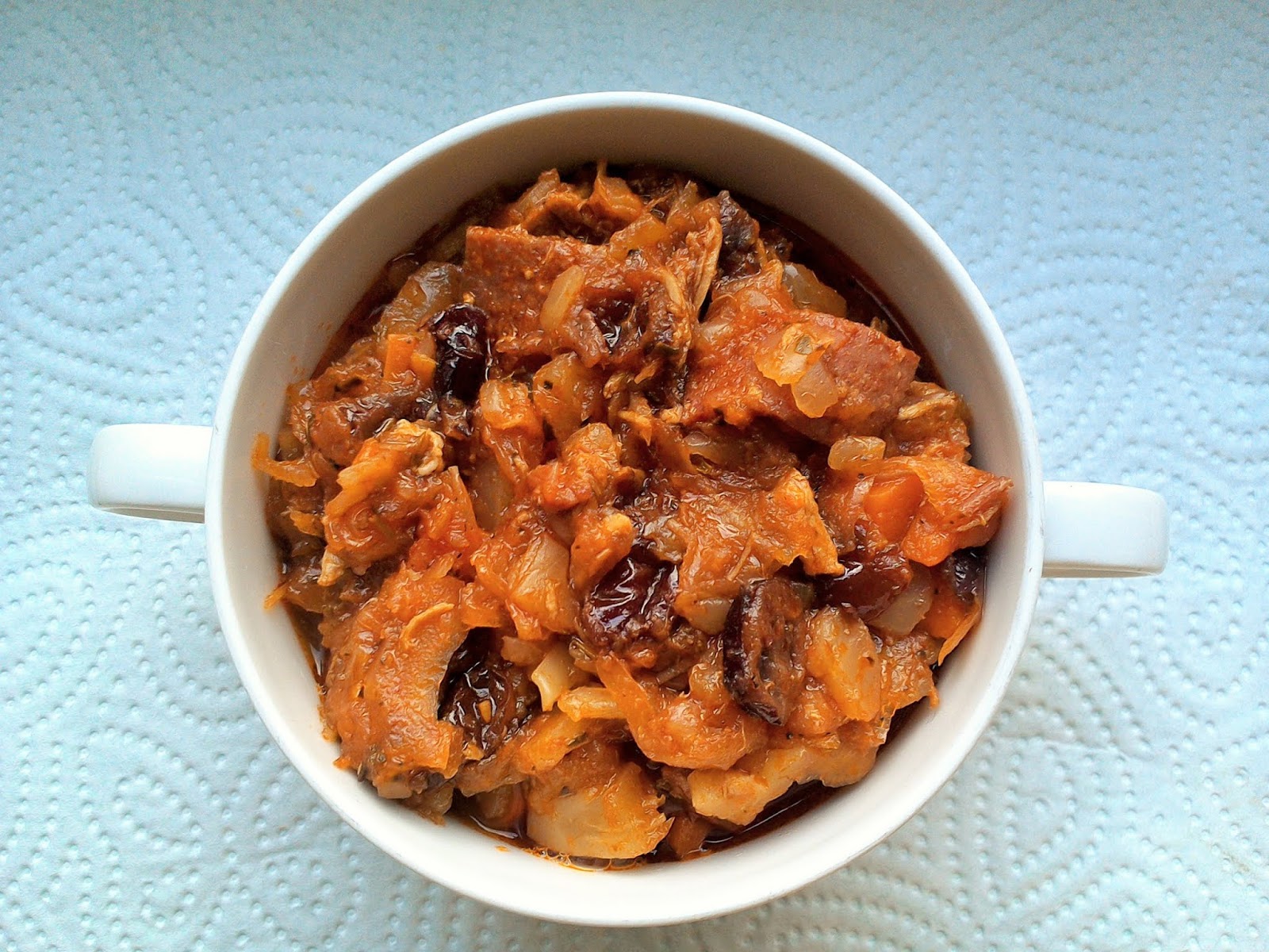 Zapraszam na smaczny bigos, który przygotowałam z kiszonej i słodkiej kapusty oraz marchewki. Z dodatkiem mięsa, wędliny i boczku oraz suszonej żurawiny. Polecam.