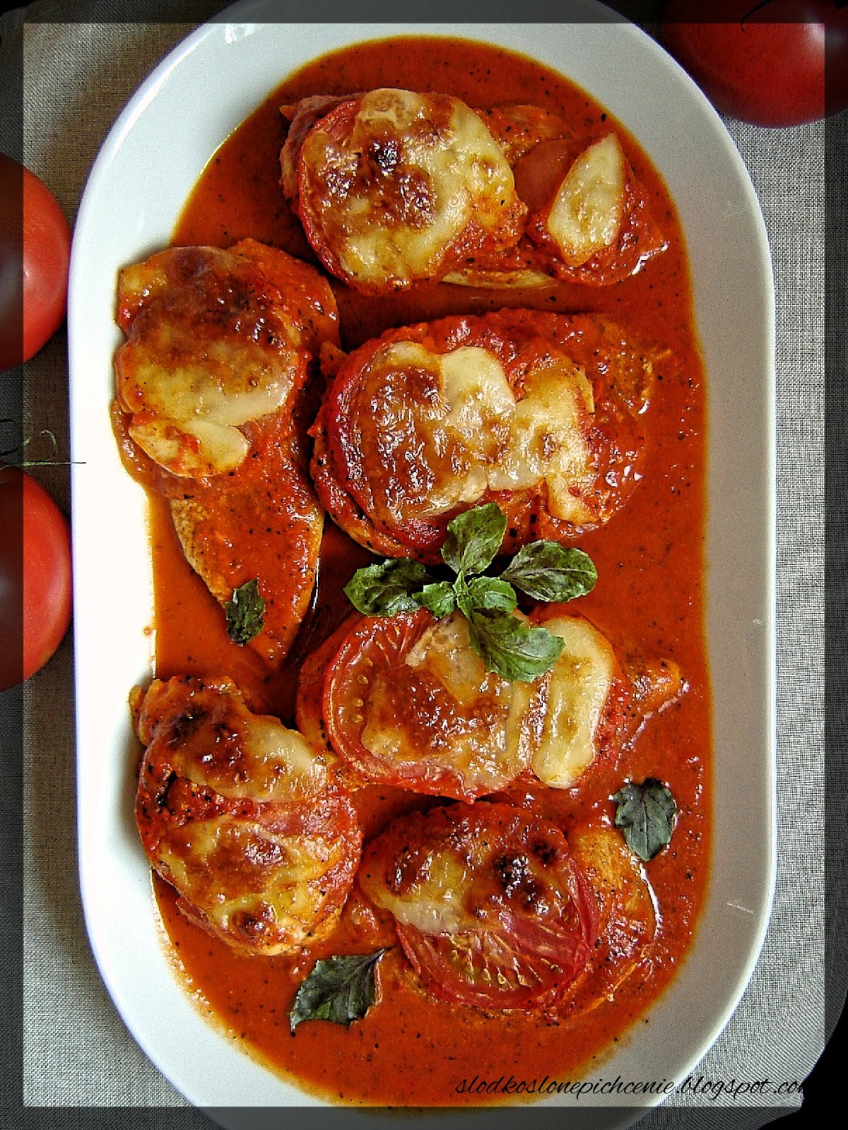 Piersi z kurczaka z pomidorem i mozzarellą zapiekane w w sosie paprykowo-pomidorowym to pomysł na pyszny obiad. 🙂