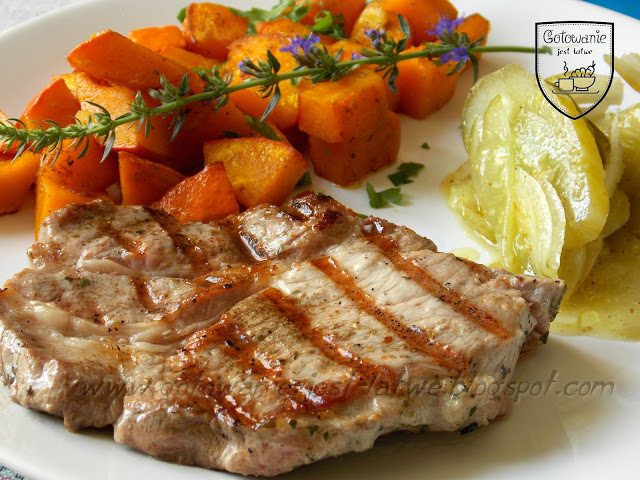 Karkówka grillowana, dynia z czosnkiem i surówka z ogórków kiszonych