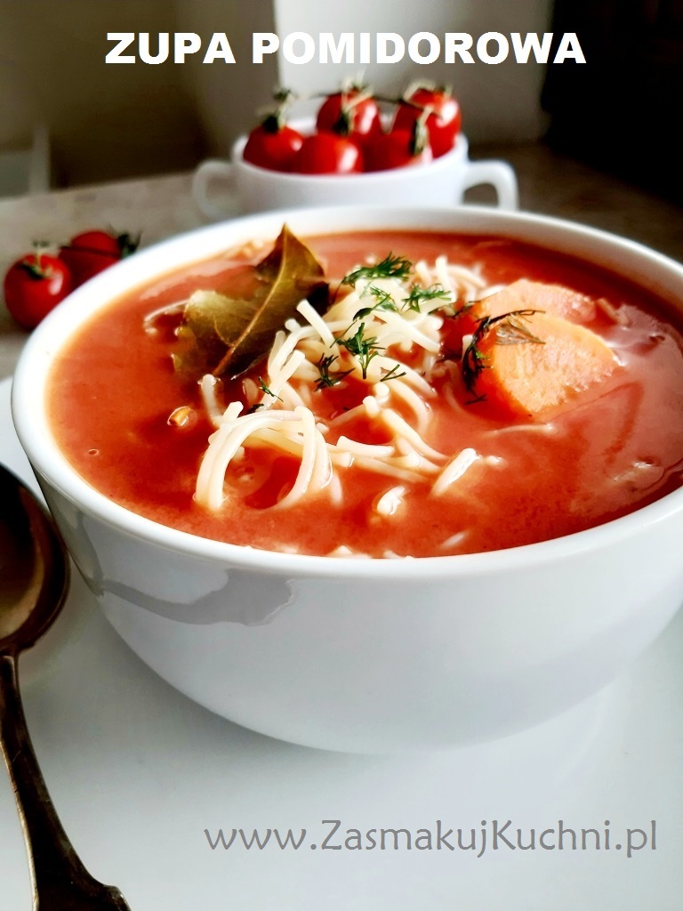 Dziś ekspresowa zupa pomidorowa, bez mięsa, na bulionie warzywnym, aromatyczna, mocno pomidorowa, z dodatkiem pomidorków koktajlowych, podana ze śmietaną i koperkiem. Zupa, która niewątpliwie pachnie domem i słodyczą pomidorów. Podaję ją z makaronem lub ryżem, dekoruję koperkiem lub natką.