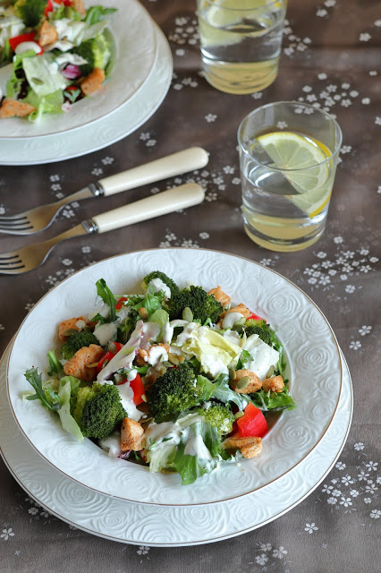 Bardzo smaczna i sycąca sałatka, która idealnie sprawdzi się na obiad lub podwieczorek. Sałatkę można polać dipem po jej przygotowaniu już na talerzach lub wymieszać wszystkie składniki wraz z dipem. Mi osobiście bardzo smakowała i na pewno niejednokrotnie wrócę do tego przepisu.