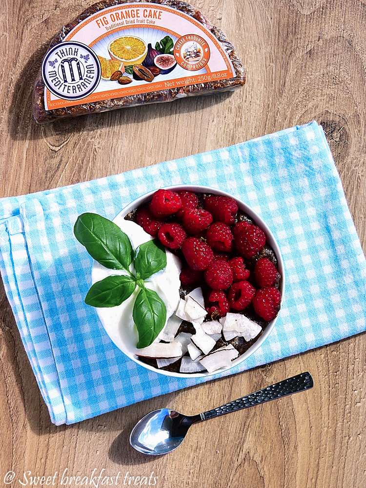Czekoladowy krem jaglany z puree z mango podany z serkiem naturalnym, malinami,…