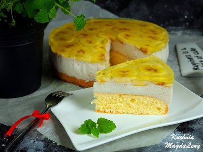 Ciasto bananowe przygotowane na biszkopcie, z jogurtową masą bananową słodzoną miodem oraz plasterkami banana i galaretką cytrynową. Bardzo łatwe w wykonaniu! Pyszny i lekki deser, który również można przygotować w zdrowszej wersji – bez dodatku cukru. Wystarczy cukier w biszkopcie zamienić na ksylitol lub erytrol, a zamiast zwykłej galaretki użyć