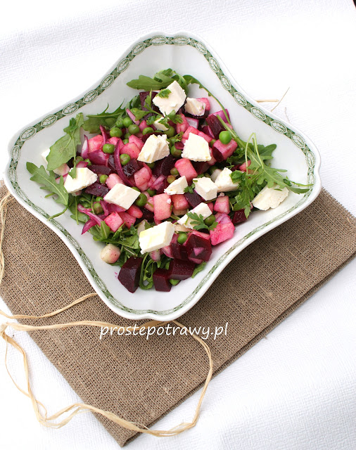 2 ugotowane czerwone buraki – średniej wielkości1 czerwona cebulaok. 10 dag sera typu włoskiego1 gruszka, obrana i pokrojona w kostkę ok. 10 dag ugotowanego zielonego groszkusól, pieprz i oliwa, natka pietruszki, 1 łyżeczka miodu i łyżka octu jabłkowego- wymieszać ocet z miodemPrzygotowanie :Ugotowane