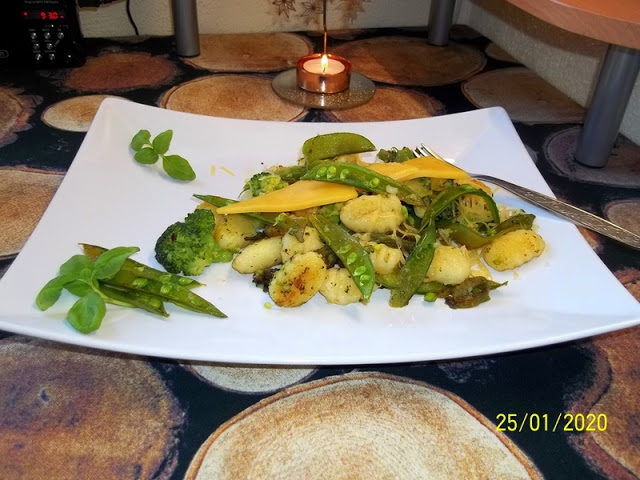 -35 dkg gnocchi-15 dkg zielonych fasolek szparagowych-20 dkg brokuła-10 dkg groszku cukrowego-2 szczypiorki z cebulkami-5 dkg twardego żółtego sera-sól, pieprz lub przyprawa harissa-odrobina masła, olej-ewentualnie cytryna