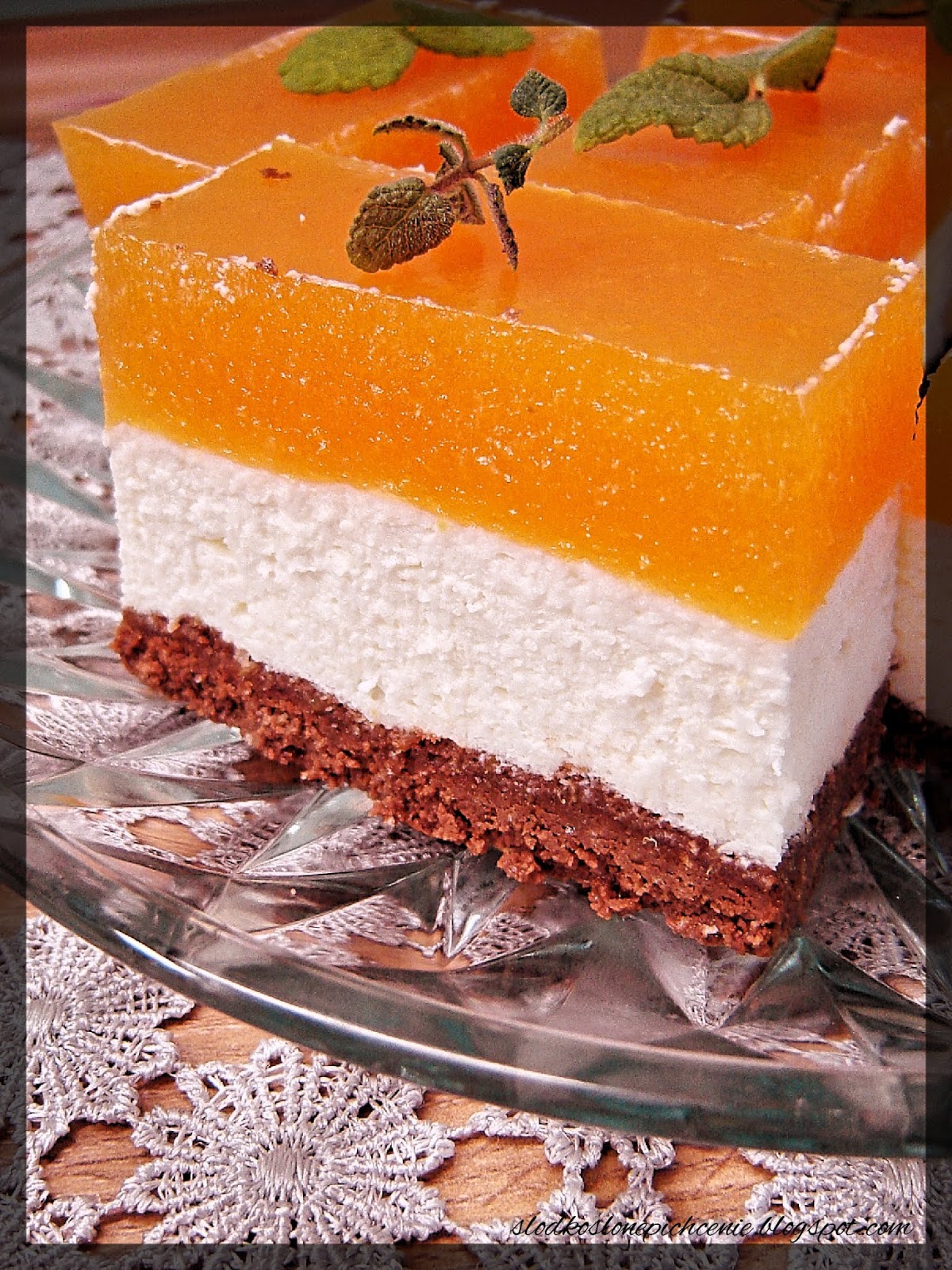 Ciasto śmietanowo-serowe bez pieczenia z dodatkiem musu brzoskwiniowego, na chrupiącym spodzie, tj. sucharków wymieszanych z kremem czekoladowym to obłędne w smaku ciasto.