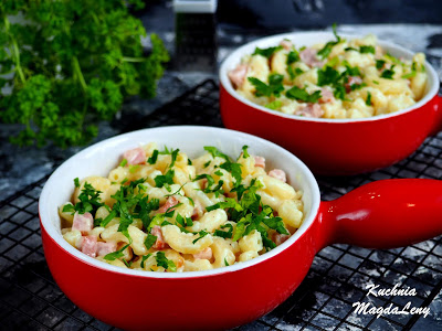 Bardzo proste danie obiadowe z kilku podstawowych składników i makaronem w roli głównej. Gotowe w 15 minut! Makaron typu kolanka z kawałkami szynki i kremowym sosem serowym, który oblepia każdy kawałek makaronu. Sos serowy przygotowany został na mleku z dwoma rodzajami sera – mozzarellą oraz cheddarem. Danie dość kaloryczne, ale