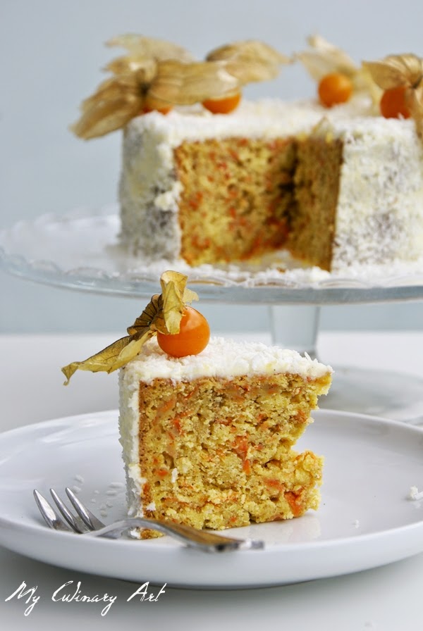 Pyszne, mięciutkie i aromatyczne ciasto marchewkowe, posypane wiórkami kokosowymi i ozdobione owocami…