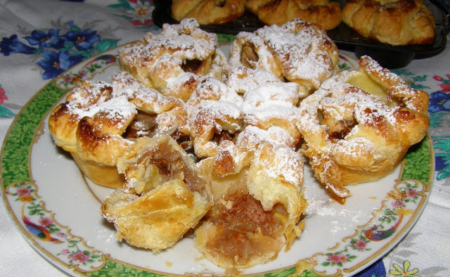 ciasto francuskie nie mrożone 2 rolki, jabłka mniejsze 6 sztuk, miód lipowy 12 łyżeczek, orzechy włoskie 100 gram, wiórki kokosowe 12 łyżeczek, cynamon mielony – ile potrzeba, puder cukier – ile potrzeba
