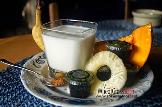 trawa pszeniczna + mleko roślinne + banan + ananas + dynia + cynamon